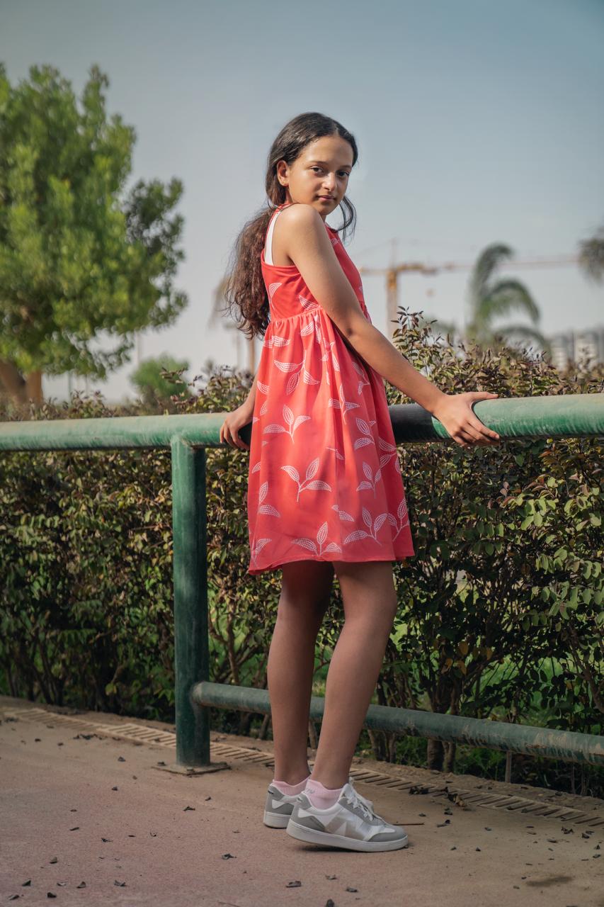 A vibrant watermelon-pink dress with delicate white leaf prints and a playful cross-back design. Made...